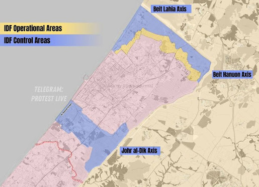 IDF kovinio inžinerijos korpuso 601-asis padalinys valo didžiulį žemės plotą centrinėje Gazos dalyje, padalydamas 25 mylių ilgio teritoriją į dvi dalis. Vadinamasis Netzarimo koridorius (749-asis greitkelis), kertantis Gazos ruožą iš rytų į vakarus, užtikrins greitesnį susisiekimą teritorijoje veikiančioms IDF pajėgoms, taip pat taps svarbia Izraelio saugumo kordono, skiriančio šiaurę nuo pietų, dalimi. Neabejotina, kad palei koridorių, taip pat vakarinėje pakrantėje esančiose vietovėse bus įrengti kariniai forpostai. Šių veiksmų tikslas - apsaugoti naujų gyvenviečių, kurios bus statomos į šiaurę nuo koridoriaus, plėtrą. Trumpai tariant, Izraelio vyriausybė karą su „Hamas“ naudoja tam, kad nukreiptų dėmesį nuo savo tikrojo tikslo - žydų valstybės plėtros palestiniečių žemėje.